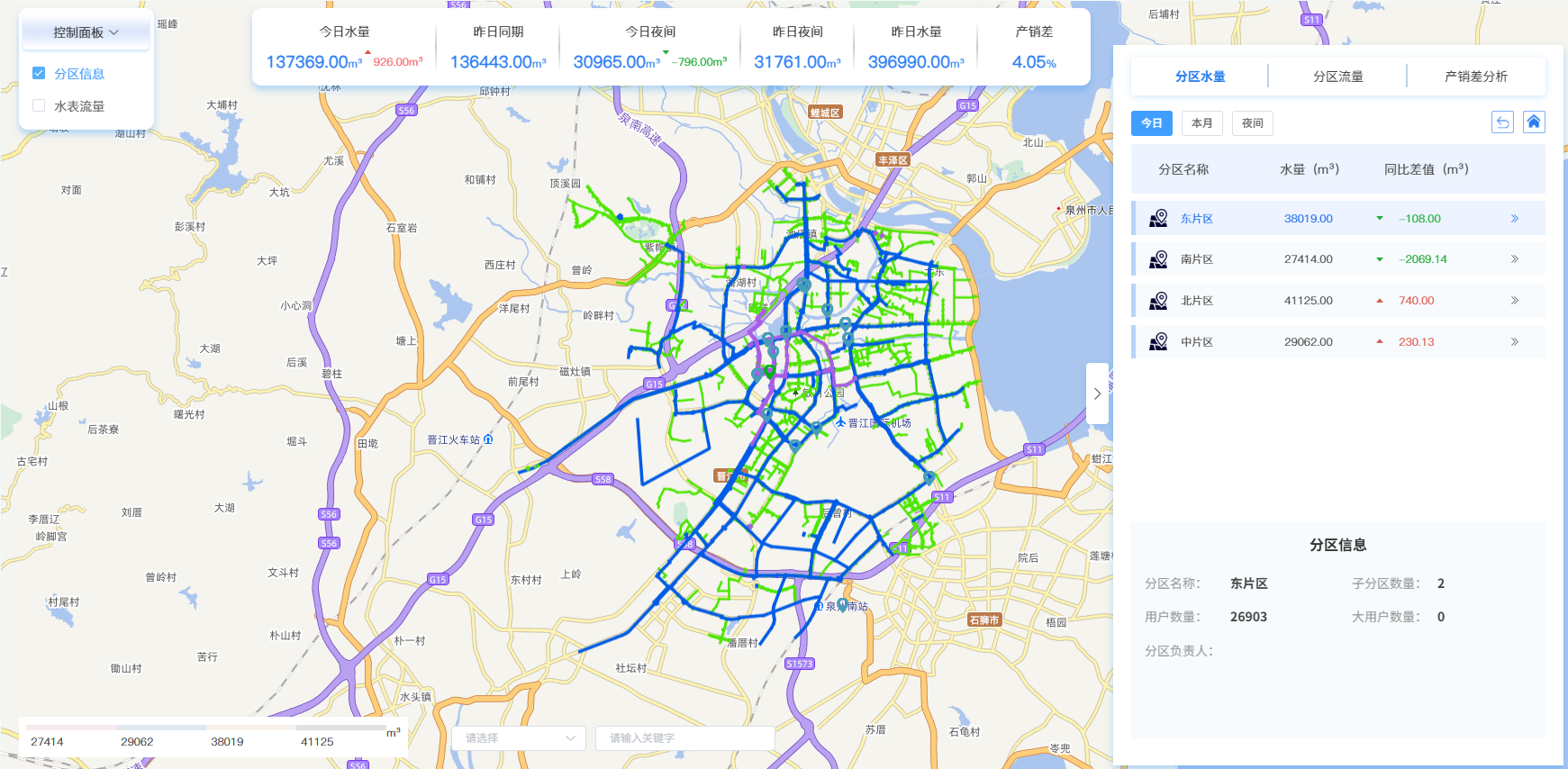 晉江項目落地后,晉江分區漏損率一直穩定在6.5%。在傳統解決方案中,我們從漏損發生到定點,需要2-3天,水量流失達幾百噸每小時。而我們可以通過分區計量系統將整個城市的供水管網進行區域化、網格化管理劃分,根據管網的服務面積、管網長度,將供水區劃分為多個可計量區域,相當于每一段管網都有一個“管家”。以無線通信實時傳輸流量、壓力、水質等數據,配合山科智能AI問答,只需要5分鐘,就能迅速定位漏點區域,再結合智能預警系統探頭音頻分析和現場確認,最終精準找到漏點。