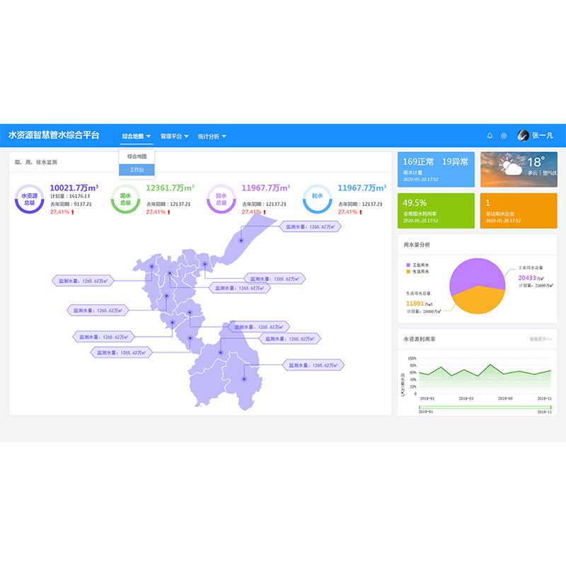 平臺以數字化手段變革水資源管理方式,通過多部門協同、深層細化管水維度,實現水資源用水總量控制以及生活、工業、農業分場景用水控制。全力提升算力,構建管網異常監測模型,管網漏損預警模型、流程重塑模型等研判手段,致力提升水資源節水及管水效率。